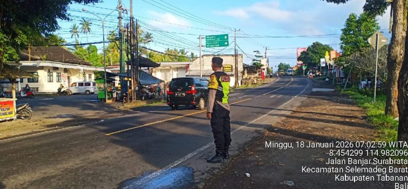 Suraberata, Minggu 18/1/2026 Pukul 07.00 s/d 08.00 wita Guna menjaga keamanan dan kelancaran lalu lintas, keramaian aktivitas masyarakat di pagi hari, Personel Polsek Selbar AIPTU I Ketut Agus Suryadi Laksanakan Strong Point di Depan Pasar Suraberata antisipasi Gangguan Kamtibmas di pagi hari demi keselamatan dan kelancaran pengguna jalan Raya di Kecamatan Selemadeg barat, Kabupaten Tabanan.