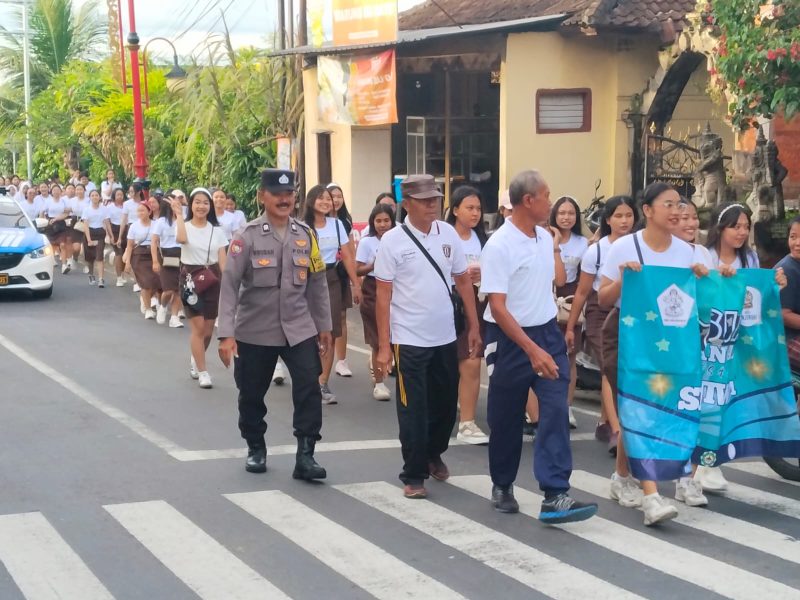 Gianyar – Dalam rangka menjaga keamanan dan kelancaran kegiatan masyarakat, Bhabinkamtibmas Kelurahan Gianyar bersama Babinsa melaksanakan pengamanan dan pengaturan arus lalu lintas pada kegiatan jalan santai dalam rangka Hari Ulang Tahun (HUT) SMK Sanjiwani Gianyar.