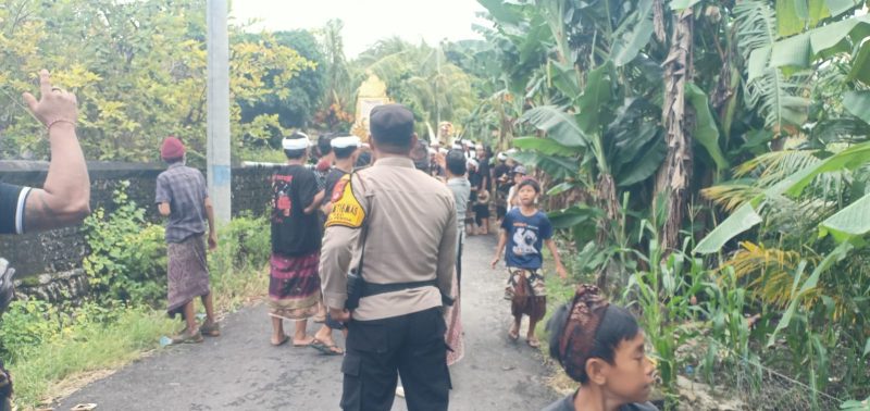 Polres Klungkung – Bhabinkamtibmas Desa Ped Polsek Nusa Penida Aipda I Kadek Suarmada bersama anggota piket Samapta, di bawah pimpinan Kanit Samapta Polsek Nusa Penida Iptu I Wayan Sudira, bersinergi dengan Pecalang Banjar Adat Sental Kangin melaksanakan atensi pengamanan kegiatan upacara adat keagamaan Pitra Yadnya di wilayah desa binaan, Banjar Sental Kangin, Dusun Sental, Desa Ped, Kecamatan Nusa Penida, Kabupaten Klungkung, (27/1).