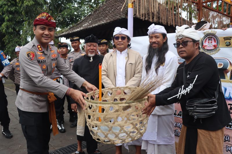 KARANGASEM – Dalam rangkaian kegiatan Bakti Sosial Religi pasca Usaba Pitra di Pura Dalem Puri Besakih, Kapolres Karangasem AKBP I Made Santika, S.H., S.I.K., M.I.K., tidak hanya memimpin kegiatan bersih-bersih, tetapi juga menyerahkan bantuan berupa alat-alat kebersihan kepada pengemong (pengelola) Pura Dalem Puri Besakih.