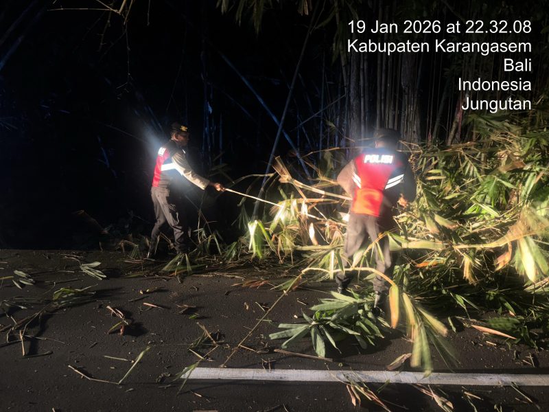Bebandem – Personel Polsek Bebandem menunjukkan aksi sigap dalam menjaga keselamatan pengguna jalan. Di tengah pelaksanaan Patroli KRYD Barcode Blue Light Patrol pada Senin malam (19/1), petugas melakukan evakuasi batang bambu yang roboh dan melintang di jalan raya wilayah Banjar Dinas Mumbul, Desa Jungutan.
