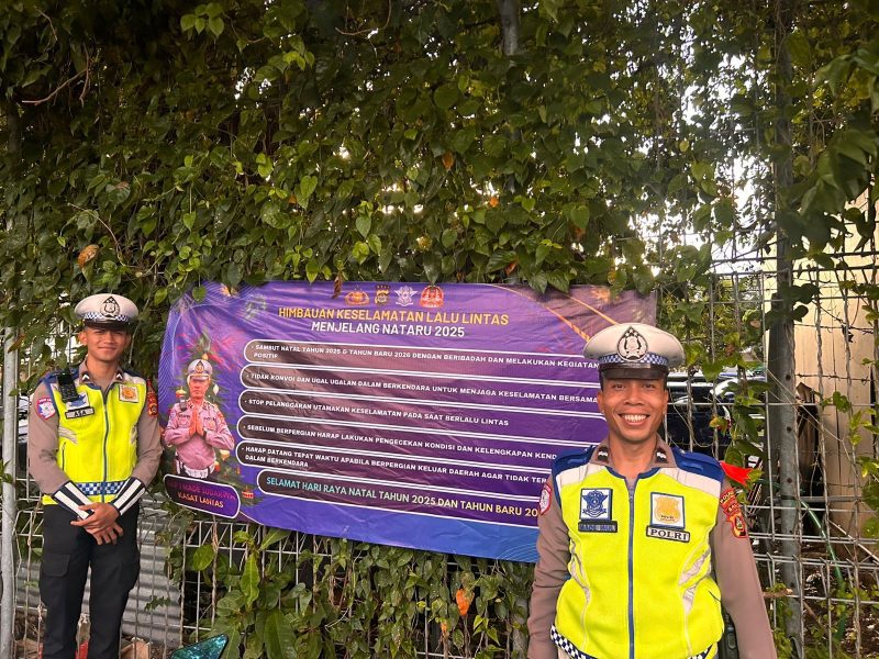 Badung — Personel Satuan Lalu Lintas (Satlantas) Polres Kawasan Bandara I Gusti Ngurah Rai melaksanakan kegiatan pemasangan spanduk serta pembagian brosur himbauan di sejumlah titik strategis kawasan bandara, Senin (23/12/2025).