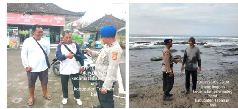 Tabanan. Personel Satpolairud Polres Tabanan melaksanakan kegiatan patroli pesisir dan sambang pantai di kawasan Pantai Selabih pada Selasa, 13 Januari 2026, pukul 10.00 Wita. Kegiatan ini bertujuan untuk memberikan rasa aman dan nyaman kepada masyarakat serta wisatawan lokal maupun mancanegara yang beraktivitas di kawasan pesisir.