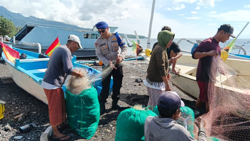 Pada Minggu, (8/2/2026) Satuan Polairud Polres Karangasem dipimpin Kaur Bin Ops Ipda I Wayan Udiana SH menunjukkan kepedulian dan kedekatannya dengan masyarakat pesisir. turun melaut langsung membantu nelayan proses melepas ikan dari Jaring hasil tangkapan Nelayan di Pesisir Pantai Ujung, Tumbu, Karangasem.