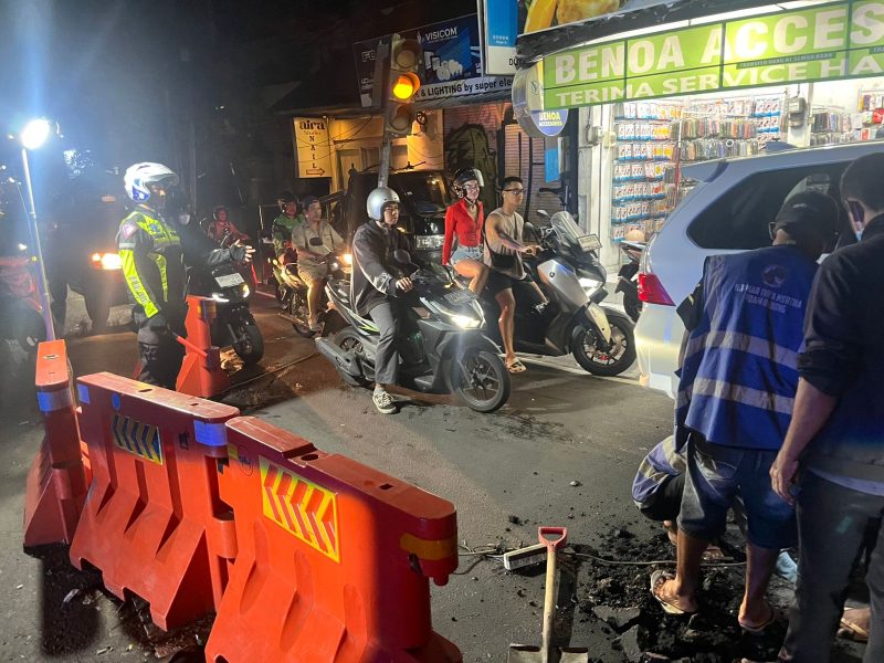 Kuta Utara – Personel Lalu Lintas Polsek Kuta Utara Aipda I Nyoman Suparta bersama Bripda Damar Piteket melakukan pengaturan arus lalu lintas malam hari di simpang Berawa, Desa Tibubeneng, Kecamatan Kuta Utara, Kabupaten Badung, Bali, terkait adanya perbaikan pipa PDAM (Perusahaan Daerah Air Minum) yang mengalami kerusakan, Rabu (3/1/2026) pukul 23.30 Wita.